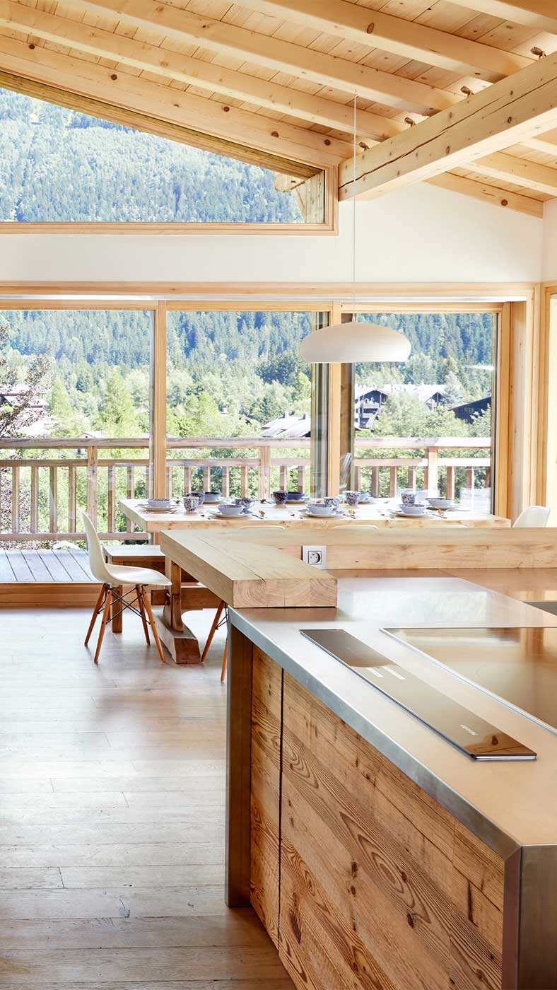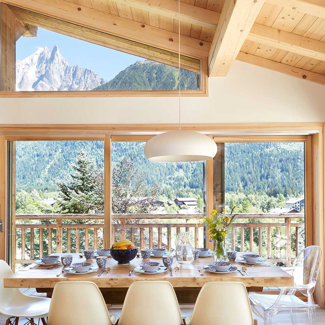 Open-plan living, dining and kitchen space with large south-facing windows and views across the Chamonix Valley.